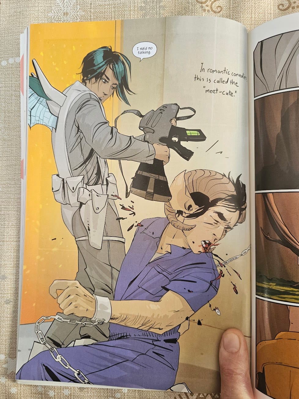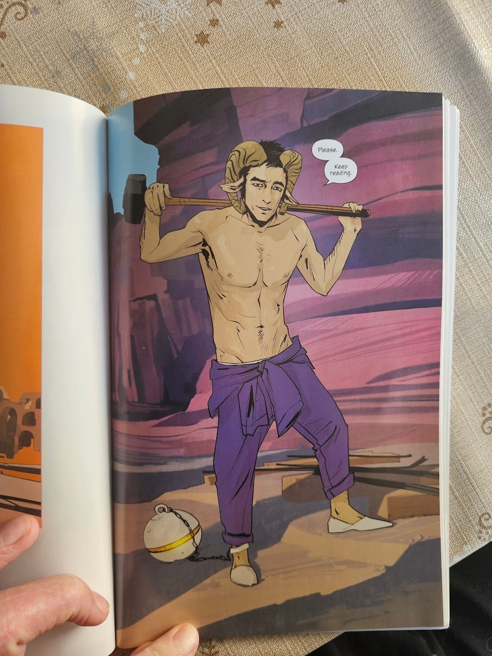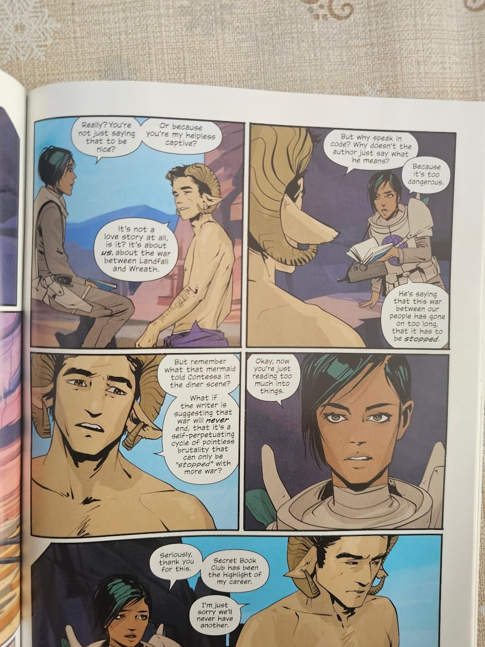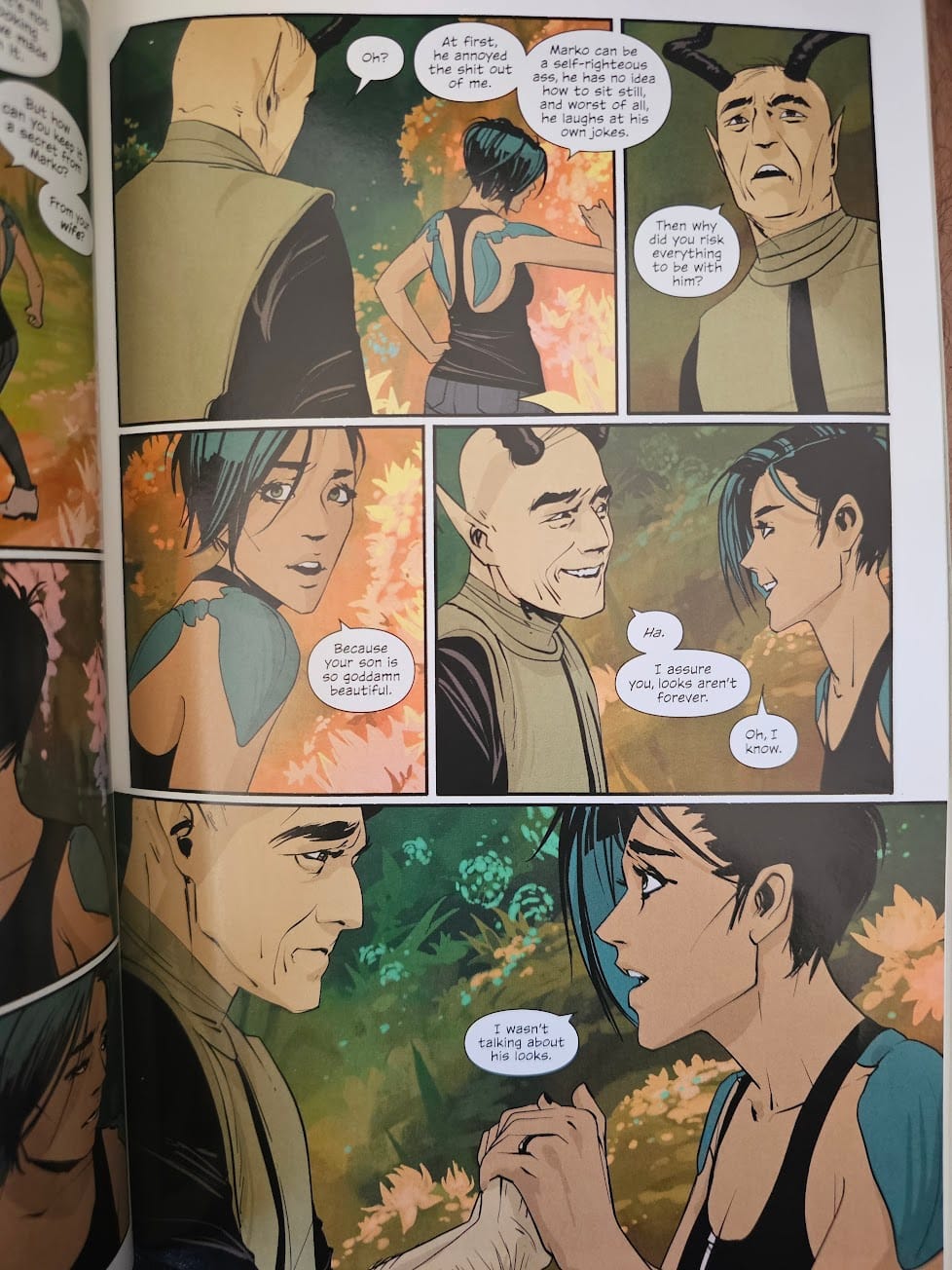 Well, in a Marko and Alana kind of way... It's interesting how they first connected, with Alana secretly reading this romance book to Marko. This book by D. Oswald Heist, seems to symbolise a lot and have a big significance to the plot. Especially, as by the end of this volume everyone is at the author’s house. It's always interesting when there's a piece of art that can be viewed as a politically charged protest, or absolute trash. I feel like, in this case, the author knew what he was doing, and wanted to put his take on the absurdity of this war out there in an unsuspecting safe way.
