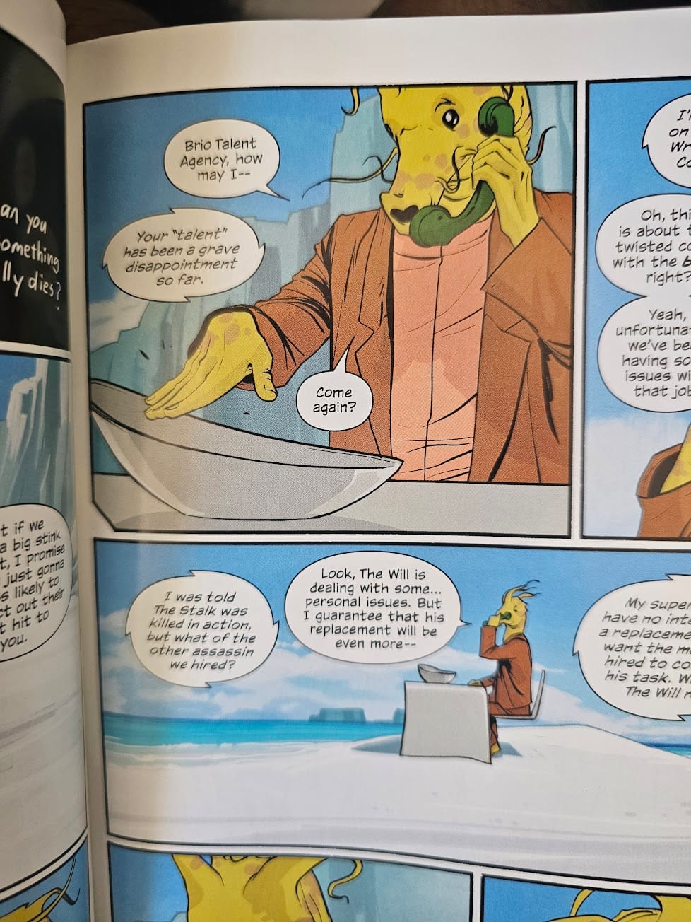 I love it when we get a little cameo of a character just living his day to day life in this bizarre world. Like this agent, no doubt just trying to earn his coin. I don’t know. It just makes me smile, and really opens the world up and allows us to see how the world functions at large.