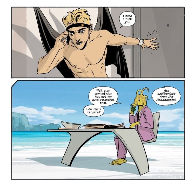 'No comment' feels very apt, as at this stage, I have literally no idea who this character is and what his role will become. However, it’s interesting that he has a direct line of call with the agent, Gale. I had no idea this seahorse looking guy would be reappearing like this, but what a treat! He even has a name now! I don’t know why I love him so much, he’s just sat on a desk, wearing a pink suit in the middle of the beach, working away, getting that coin. ICONIC.